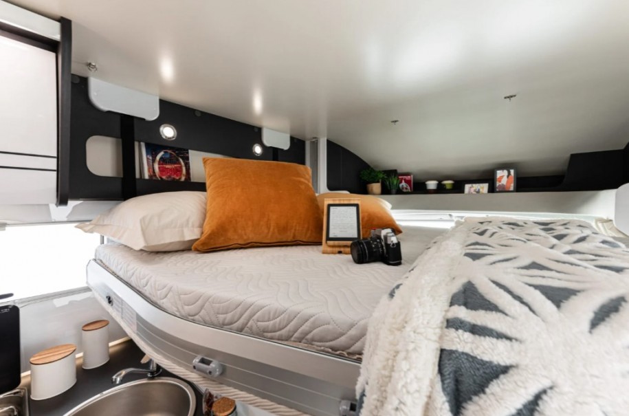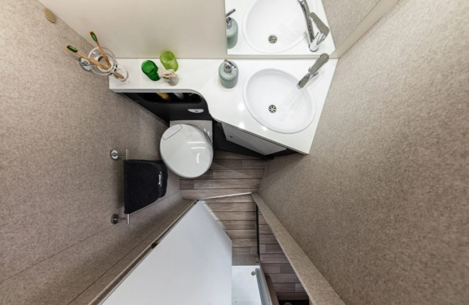 La cellule est signée McLouis, modèle MC4 379. Il s’agit d’un camping-car profilé avec lit central offrant 5 couchages et 5 places carte grise. L’agencement intérieur est conçu pour offrir confort et fonctionnalité à bord.