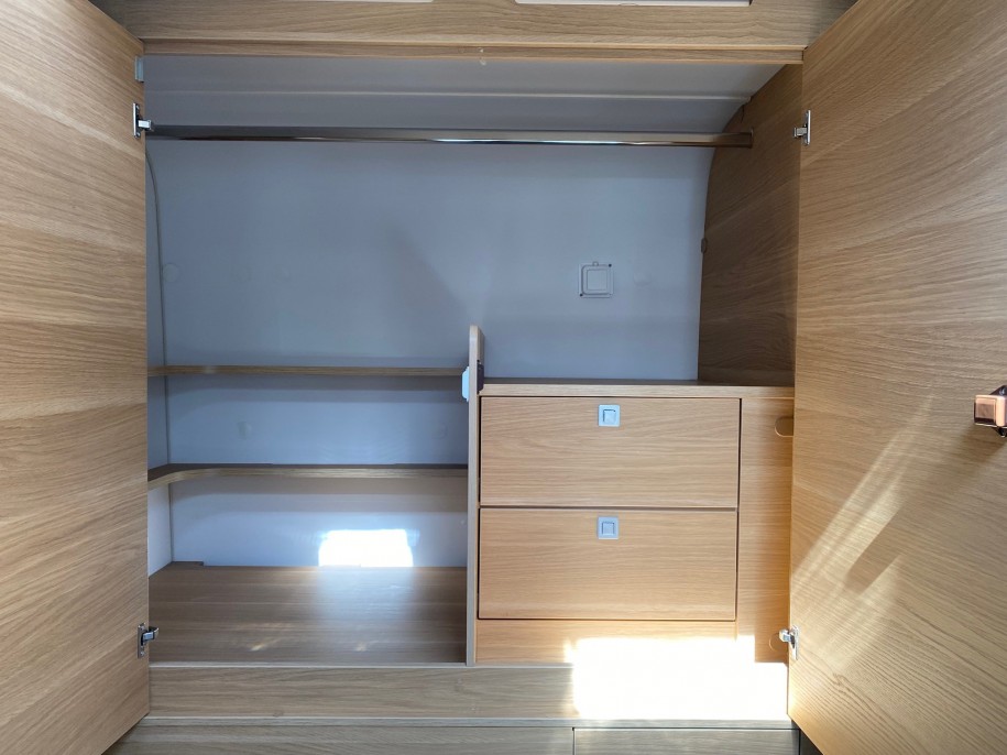 Salle de bain arrière indépendante : douche, WC, dressing, accès à la soute… du confort comme à la maison.